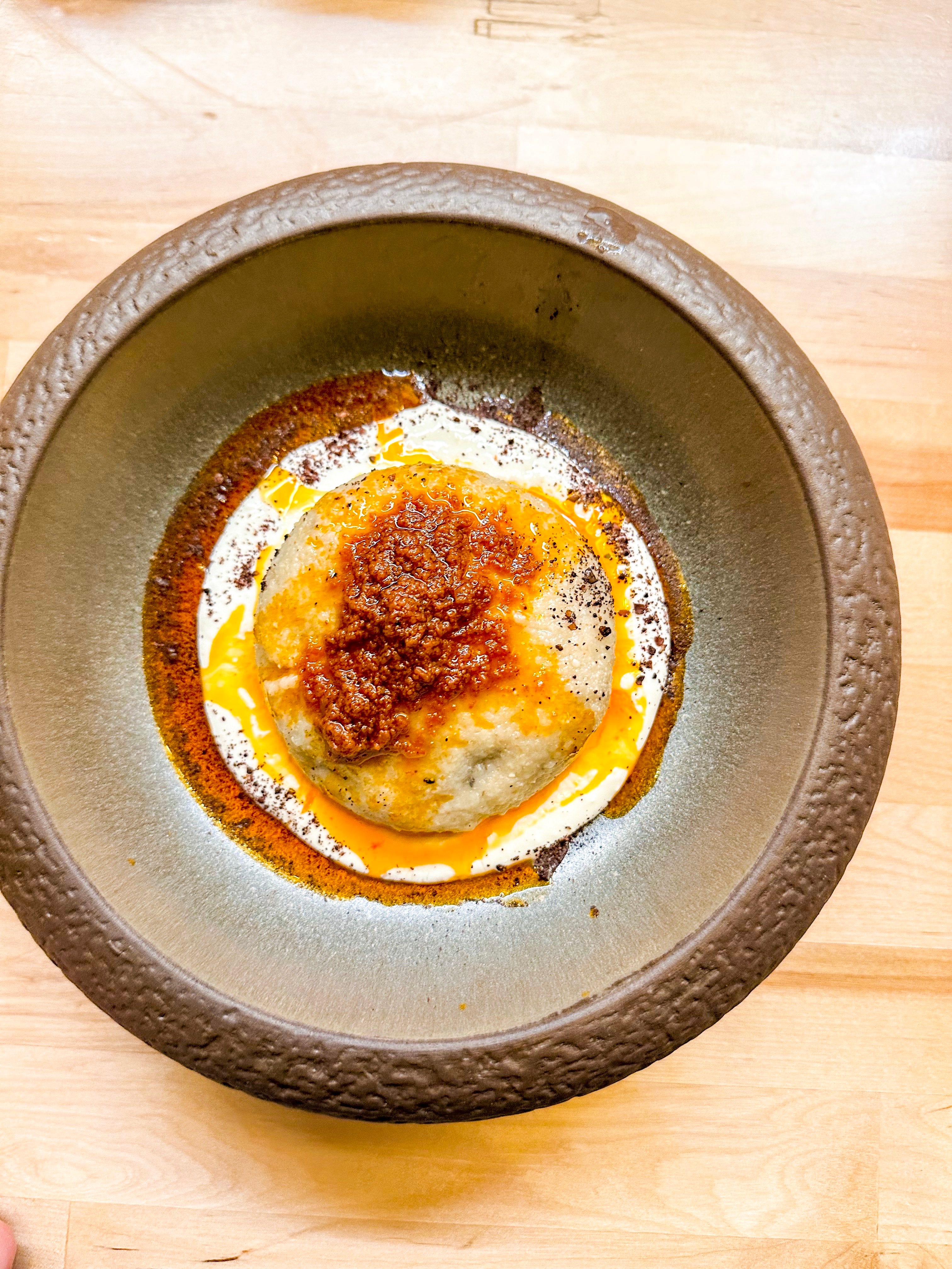 To make his first restaurant a reality with no investors and (as yet) no other staff, Okay Inak settled into a space on a solitary but well-lit block near DTLA’s Fashion District. His menu, Turkish with a global perspective, is concise. He makes three singular dishes based on family recipes that are like nothing else in Los Angeles. The biggest dazzler is kitel, a variation on içli köfte (a.k.a. kibbeh) in the shape of a smooth, large dumpling made from pounded bulgur and filled with peppery spiced beef. The presentation pulls it away from the context of home cooking; Inak serves it in a ceramic bowl garnished with Aleppo butter, yogurt, and herb oil. It’s technically an appetizer but I’d even order two as an entree. Start with corti taplamasi, a cloudy, spicy soup based on fermented cabbage; we love kimchi-jjigae in this town, and this is the correlate from a culture 4,000 miles west. For dessert: kirecte kabak, hunks of butternut squash essentially slaked in lime so they become translucent and crackly on the outside but stay meltingly soft inside when cooked. Inak sweetens them in simple syrup and finishes the whole thing with tahini and pistachios. He’s also the friendliest guy, rushing dishes out from the open kitchen and then racing back to tend to everything he has going on the stove.