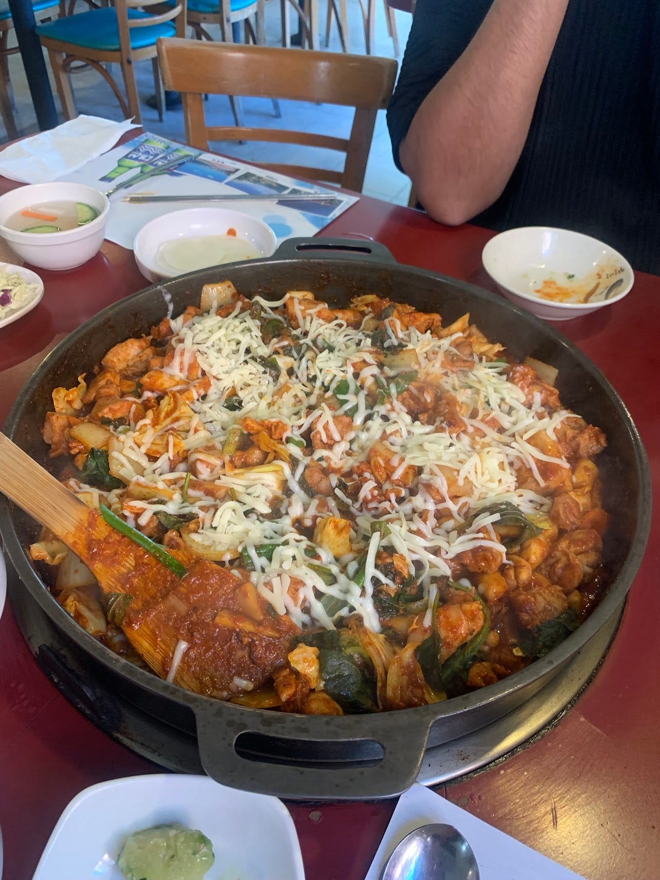 Jonathan Gold reviewed it in 2015, which is the year I moved back here, so that must be how I found it. I think it was also in a long-disappeared Lucky Peach atlas of L.A. The galbi is as much a performance as a meal you eventually eat. First, the chicken hits the tabletop grill. Then, batons of sweet potato and rice cakes. Then a chile-forward sauce, squeezed with abandon by the confident servers, and then a mountain of cabbage and green herbs. All of this cooks together into a stewy, spicy, somehow creamy mess. The cheese is optional, but also, it’s not.